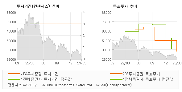 동종목에 대한 DS투자증권의 투자관은 지난 3개월 동안 큰 변화가 없었다. 목표주가는 2022년 8월 68,000원으로 상향 조정되었으며, 2022년 10월 50,000원을 바닥으로 목표주가를 제시한 후 최근 35,000원으로 재조정되었다.