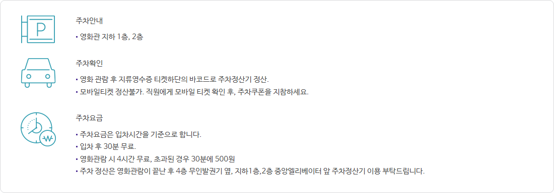 - 주차요금은 4층 무인매표기 옆, 1층 중앙엘리베이터 앞, 2층 영화관 방문 후 주차요금정산기를 이용해주세요.