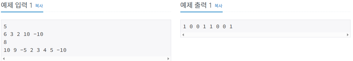 첫 번째 줄에 입력된 M 숫자의 경우, 상근에 각 숫자가 적힌 숫자 카드가 있으면 1이 출력되고 없으면 0이 출력됩니다.