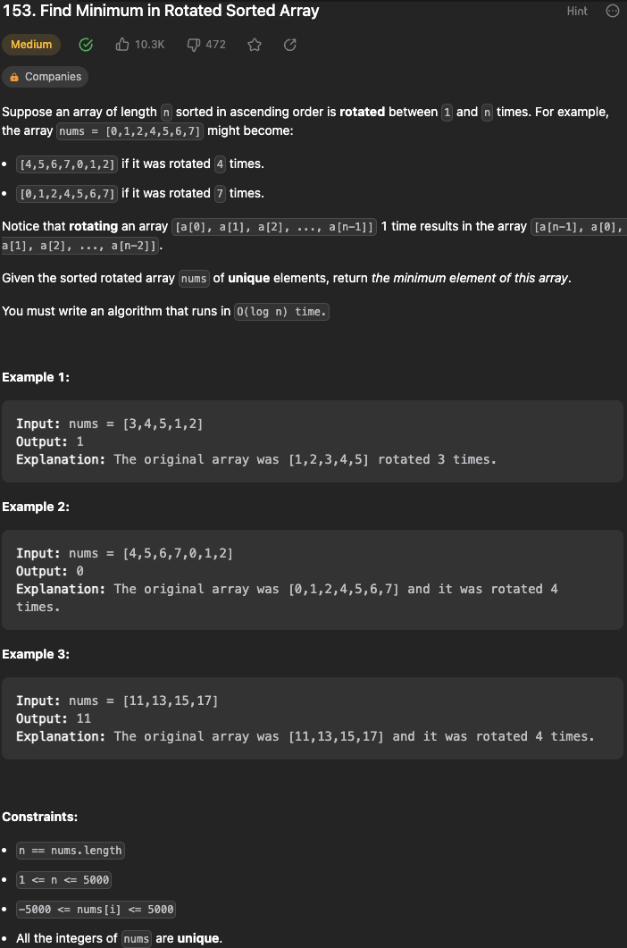 그러나 회전을 해서 일반적인 이진탐색 문제가 아니며 특정 값이 아닌 임의의 최소값을 찾는 문제임을 알 수 있다.